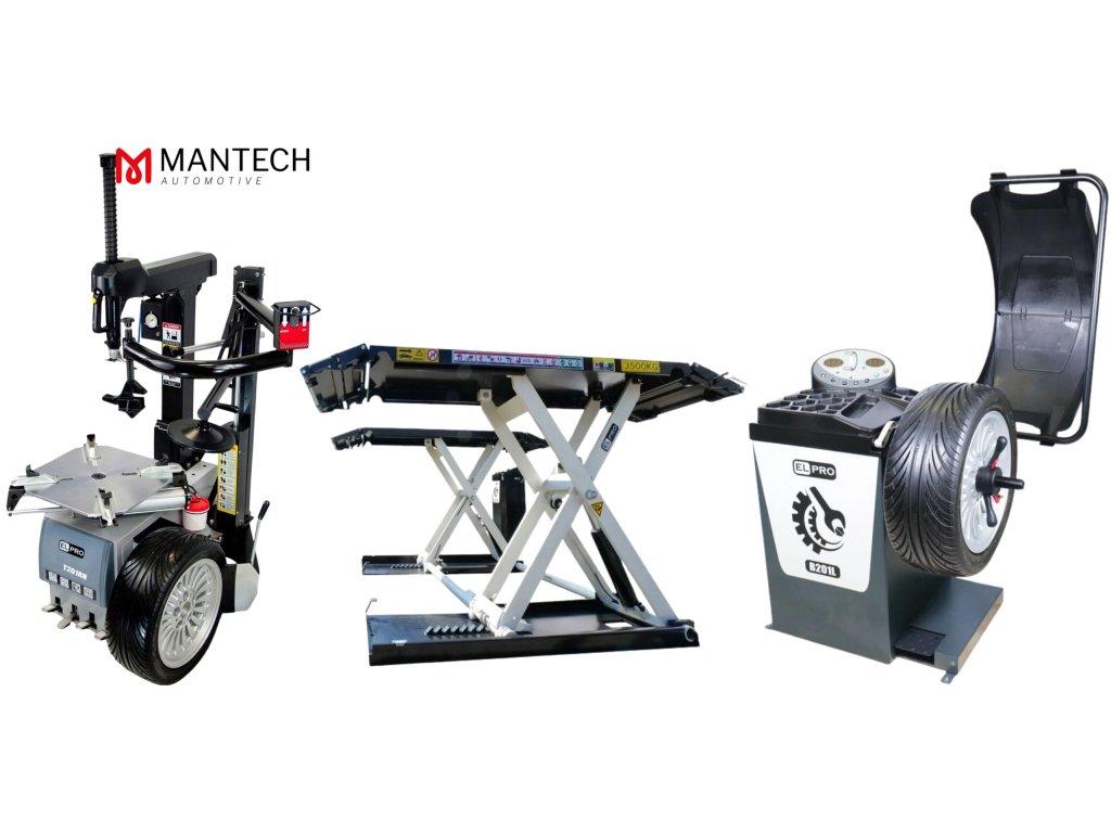 Automatická 2-rýchlostná prezúvačka T201.RN2V s ramenom RunFlat + Automatická vyvažovačka kolies B201L + Mobilný nožnicový zdvihák PN35NP