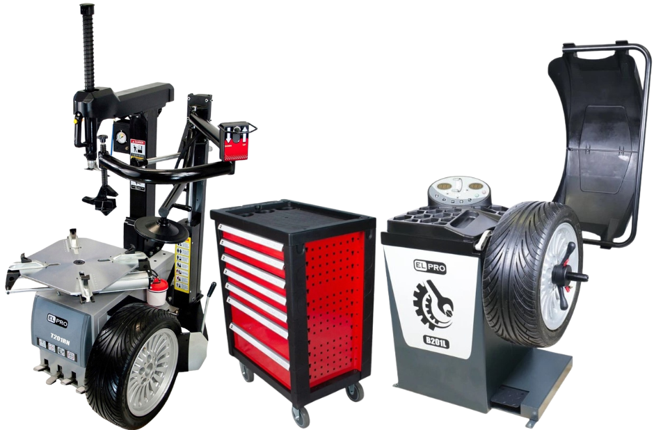 Automatická 2-rýchlostná prezúvačka T201.RN2V s ramenom RunFlat + Automatická vyvažovačka kolies B201L + Vozík na náradie, dielenská skriňa 420el